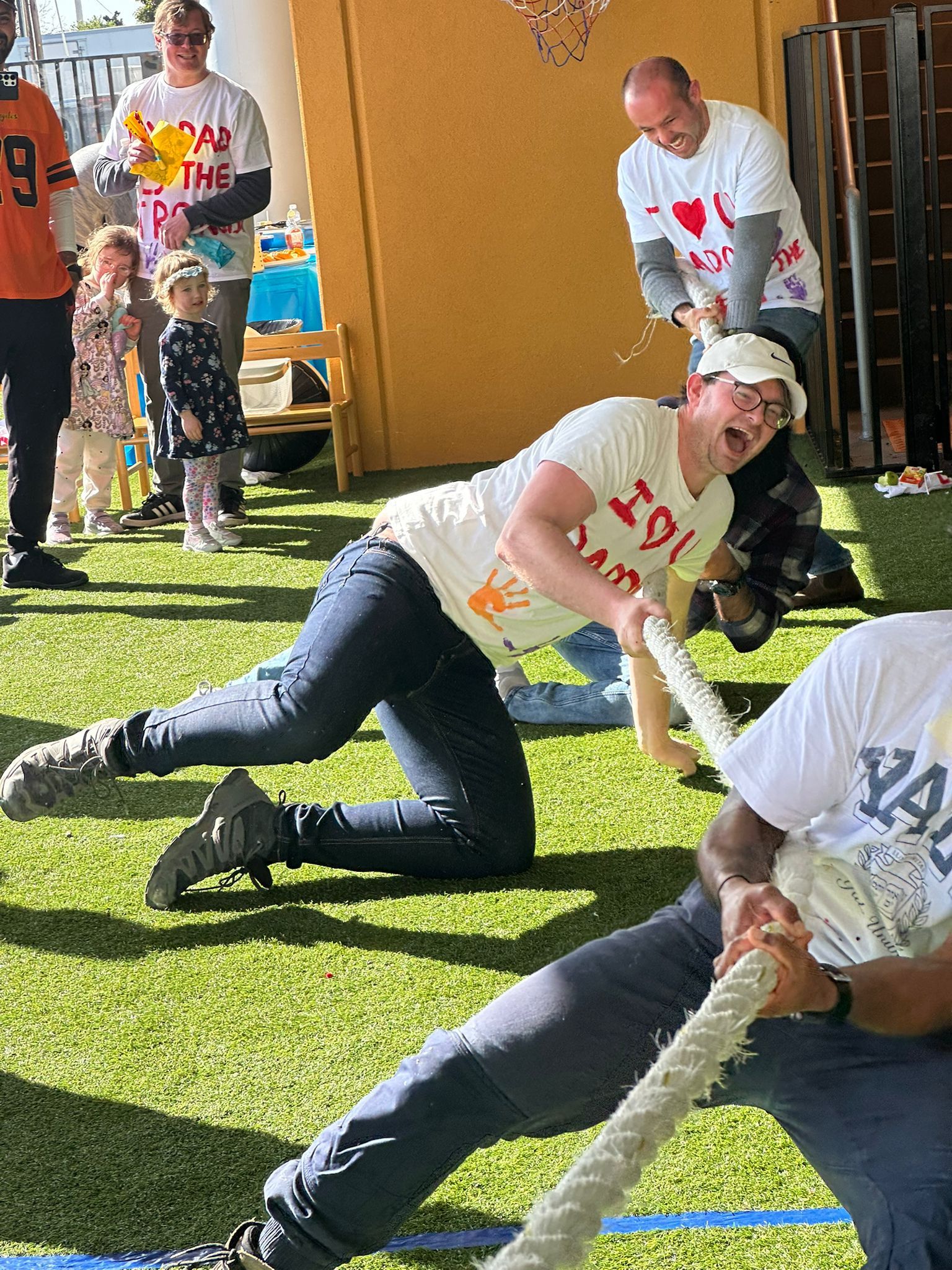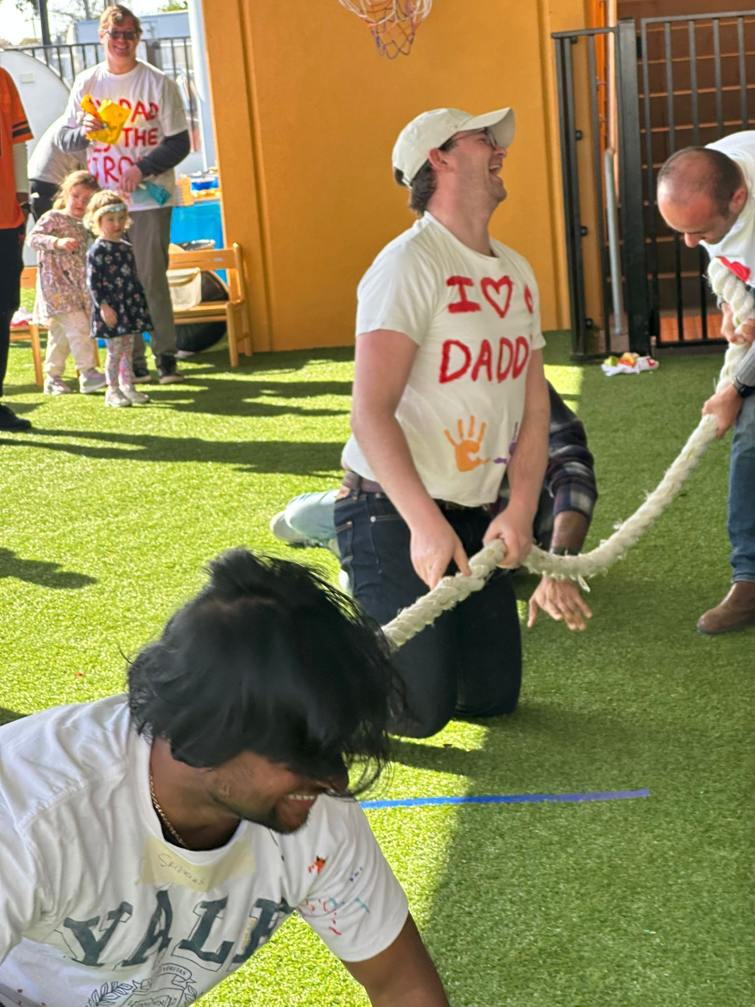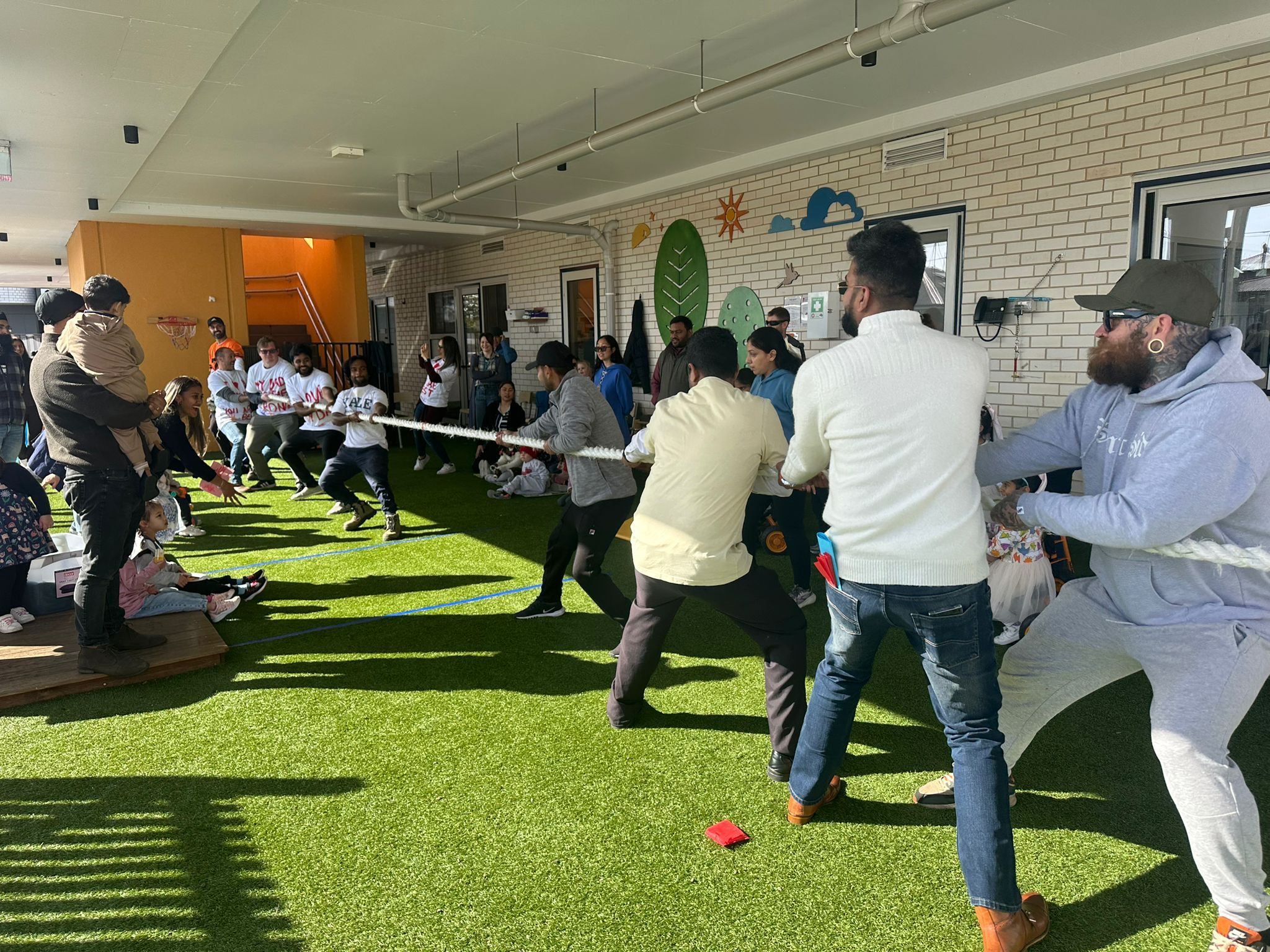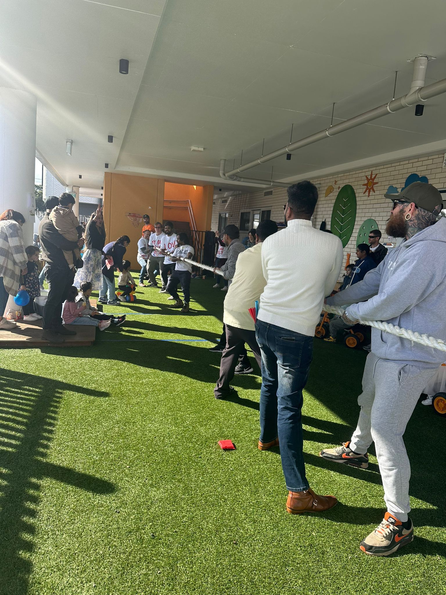Our educators had so much fun planning activities that would bring out the playful side of our dads. From the excitement of tug of war to the laughter-filled challenge of eating an apple from a bowl without using hands, the games were full of energy and smiles. The nappy-changing race was a favourite — with children cheering on their dads as they showed off their “super-dad” skills!