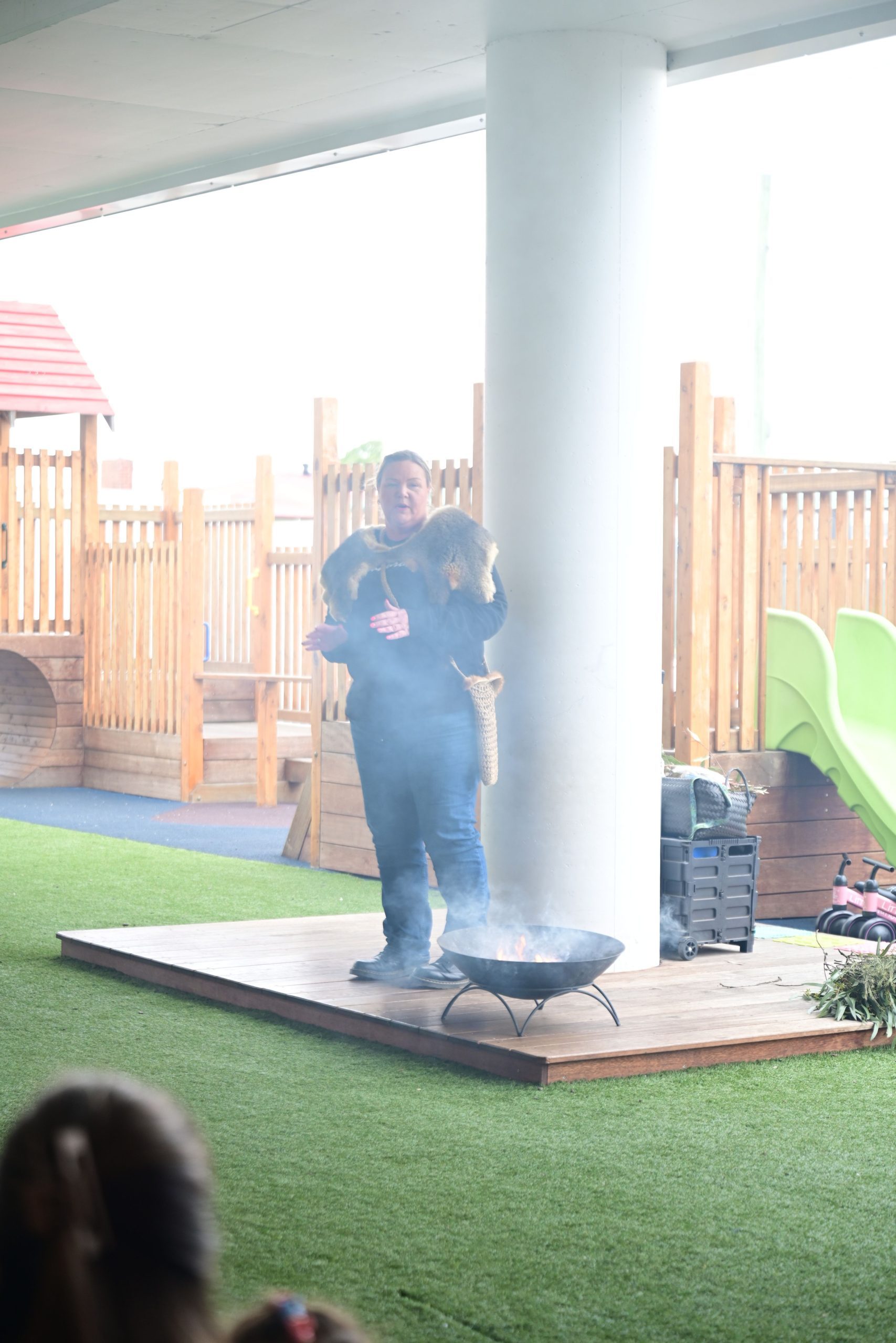 In smoking ceremony Kristy used the gentle smoke of native plants to acknowledge Country, promote wellbeing, and connect participants to ancestors, land, and story. For children, this is powerful experiential learning: they see the leaves, smell the smoke, watch it rise, and notice how people move with care and gratitude. It turns abstract ideas—respect, belonging, sustainability—into something felt with the senses.