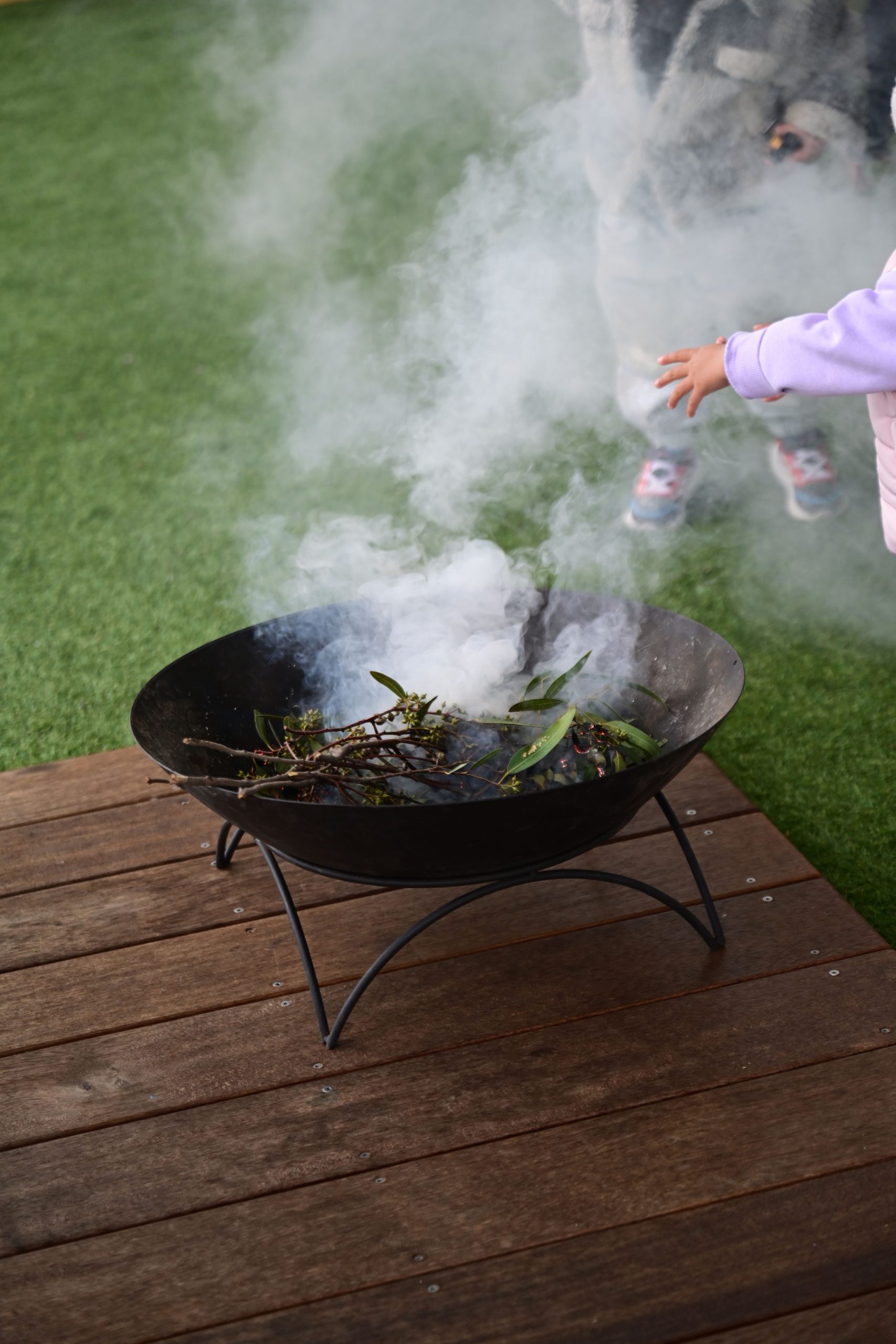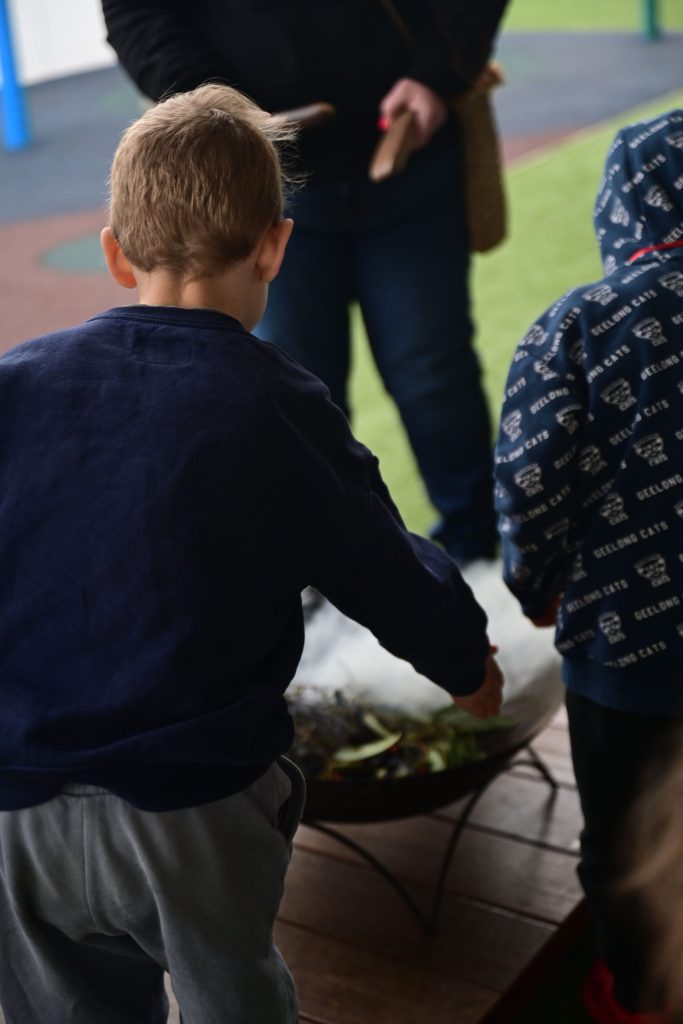 In smoking ceremony Kristy used the gentle smoke of native plants to acknowledge Country, promote wellbeing, and connect participants to ancestors, land, and story. For children, this is powerful experiential learning: they see the leaves, smell the smoke, watch it rise, and notice how people move with care and gratitude. It turns abstract ideas—respect, belonging, sustainability—into something felt with the senses.